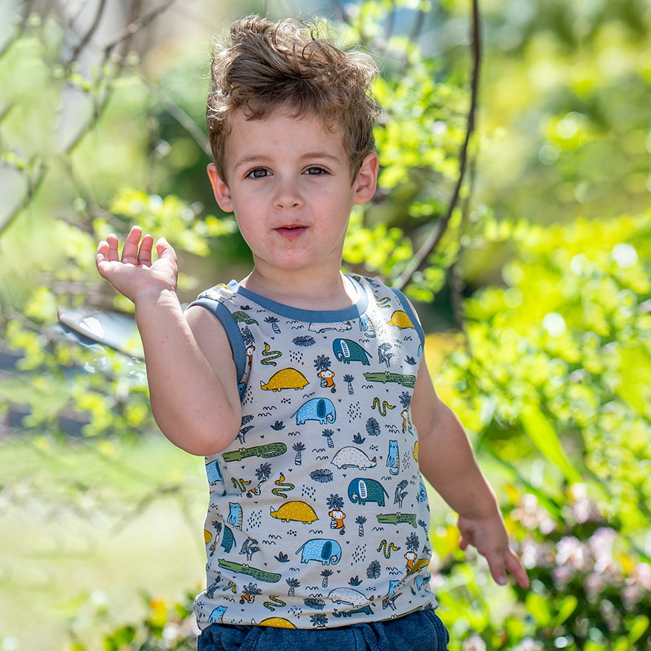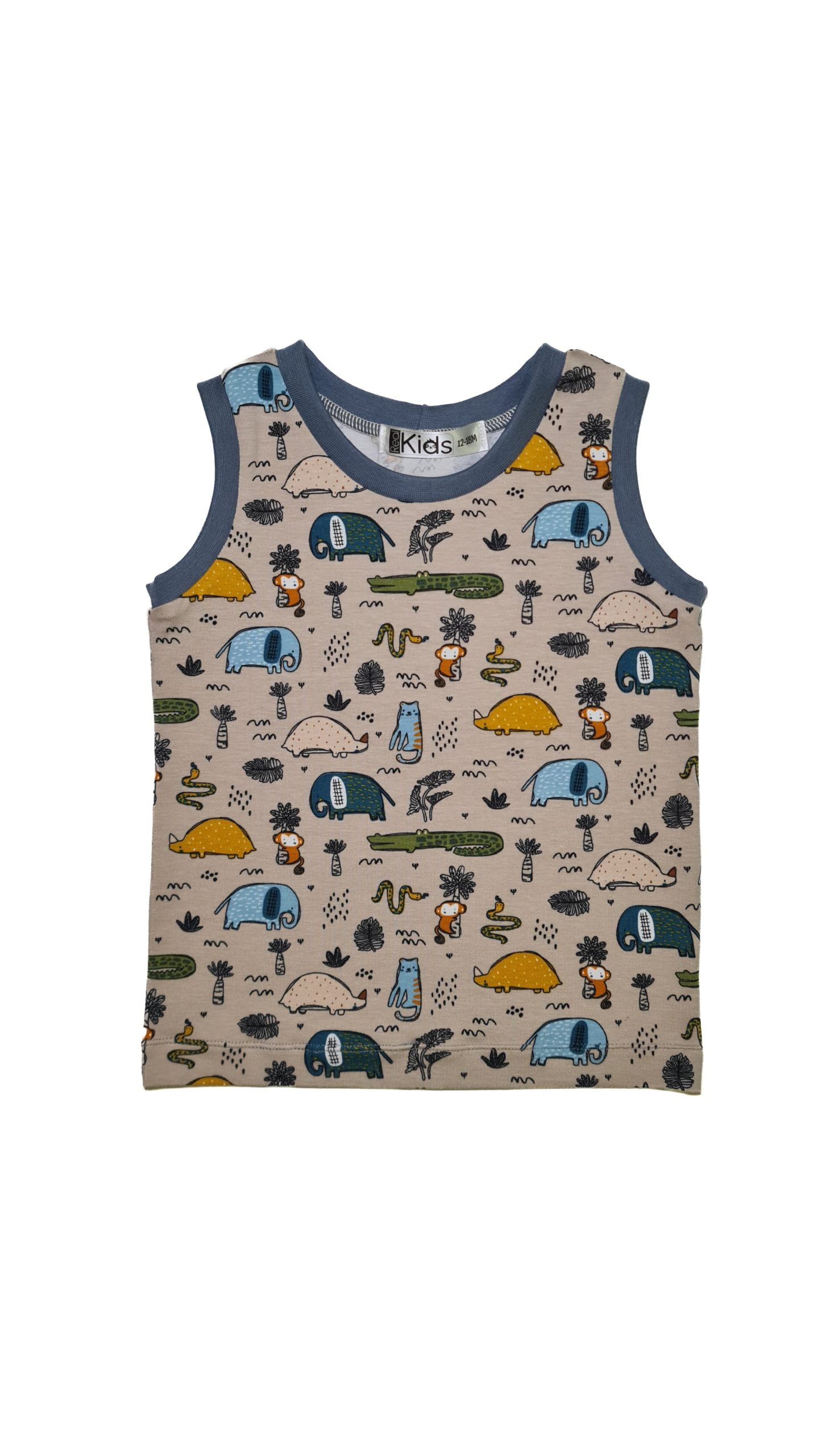 הפריט המושלם לקיץ! גופיות טריקו איכותיות, קלילות וכיפיות. גופיות צבעוניות ושמחות שיהפכו לפריט חרישה אהוב! דגם חיות סוואנה- קרם.